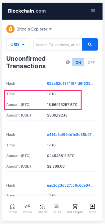 Xem ảnh dưới đây, bạn sẽ thấy có 1 giao dịch vào lúc 17:10 có amount là 18.56975257 BTC: